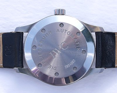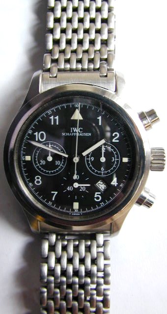 The physical resemblance IWC's Fleigerchronograph bears to it's predecessors is written all over it's face, but less obvious perhaps is the fact that it's also inherited a number of basic character traits.  Such as an antipathy towards magnetic fields, which, thanks to an additional case of ferromagnetic soft iron, are prevented from affecting the movement, just like the large pilot's watch and the "Mark XI" in their own time.  But it also represents the start of a new age in the history of chronographs.  And has put a new generation on course for a new world record - it is the smallest in the world with analogue display.  The diameter is 23.3mm, with a height of 3.7mm.  So that time can be measured in so many ways, it took 27 wheels and gears, 26 springs, cams orlevers, 25 rubies, 7 bridges, 32 screws...  a total of 233 individual parts and countless ideas.  The idea, for instance, of how to master all functions with only two step-motors:  time displayed in hours, minutes and seconds.  Date display with fast correction.  Stop-second display (accurate to 1/4 of a second), minute counter (to 3 minutes), and hour counter (to 12 hours) including incremental time counting.  All simply operated by means of push buttons above and below the crown.  The two quartz-controlled watch and chronograph movements are shock resistant at several thousands of meters above the earth and up to 50 meters underwater.  The watch comes complete with all boxes, paperwork, and a spare stainless steel IWC buckle so the watch can be fitted to a leather strap.  This watch is in truly exceptional condition.