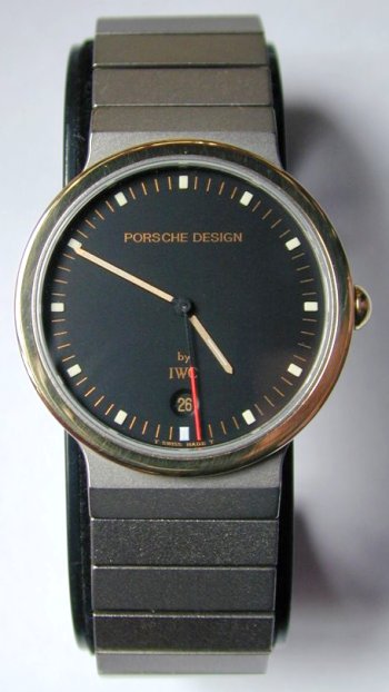 Very unusual rare model Gents titanium and 18ct yellow gold IWC International Watch Company Schaffhausen Porsche Design Ultra Sportivo quartz watch. The watch consisting of black dial signed IWC and Porsche Design, date aperture at 6 o'clock, black and gold coloured hands, and black and red sweep centre seconds hand.Titanium and 18ct yellow gold 3 piece case with screw-on case back, mineral glass, the watch on IWC Titanium bracelet with locking clasp. This watch appears to be virtually unused. A very distinctive and unusual timepiece.It comes complete with spare links,IWC link removal tool,IWC tag and IWC Porsche design case.