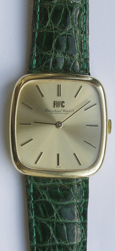 Superb solid 18 carat gold mechanical hand wound IWC (International Watch Company Schaffhausen ) wristwatch. The watch with superb brushed gold dial with baton type hour markers, cushion shaped heavy solid 18 carat gold screw back case, crystal glass and the watch on high quality crocodile strap with IWC buckle. Stunning hardly used condition. A top quality watch