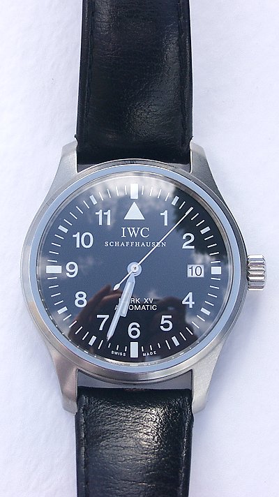 Stunning IWC (International Watch Company Schaffhausen ) Mark XV automatic date wristwatch. The watch consisting of  black dial with luminous hour markers, luminous and silvered hands, aperture for date at 3 '0' clock,crystal glass, steel screw back case self winding automatic movement. On black leather strap with folding deployant IWC clasp. This watch is in absolutely stunning condition and comes with everything it was sold with when new( box,instructions,wallets,tabs, guarantee certificate, white leather box etc. Purchased September 2001). Absolutely stunning and a good hardy quality watch